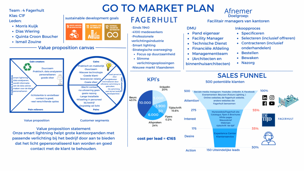 Voor dit project heb ik een GTM-strategie ontwikkeld voor Fagerhult, een specialist in slimme kantoorverlichting. Ik heb de doelgroep geanalyseerd, een value proposition uitgewerkt, een sales funnel ontworpen en KPI’s opgesteld om het product succesvol in de markt te zetten. Het project laat zien hoe ik marketingstrategieën toepas om echte zakelijke problemen op te lossen.